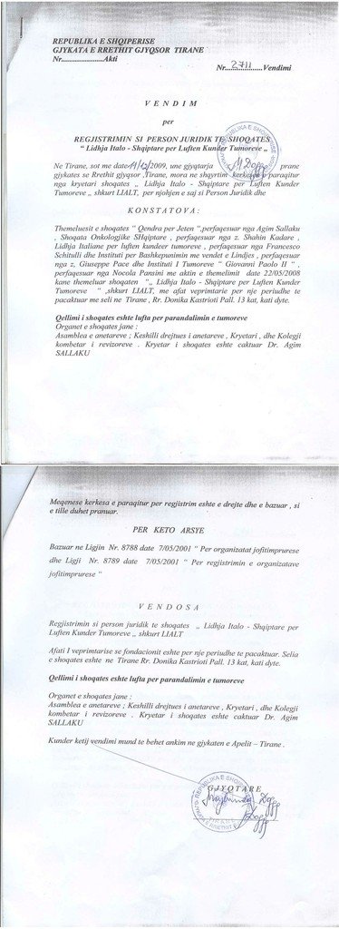 2- Nel 2011 costituii e registrai presso il Tribunale di Tirana un 'atto costitutivo relativo alla “Lega Tumori”.