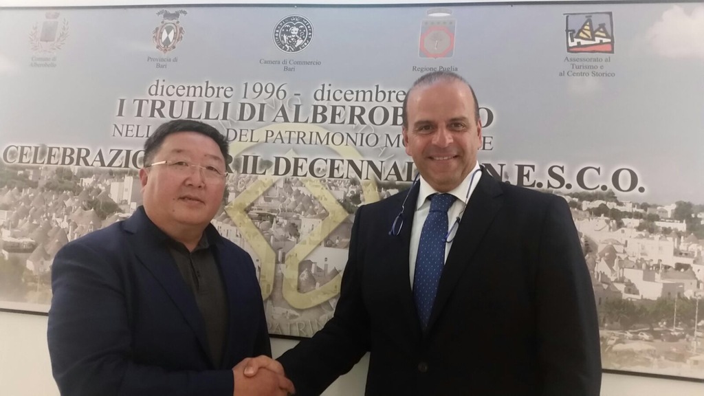 E' stata la sequenza finale di una visita nella città dei trulli, sito Unesco dal 1996, che il diplomatico del Paese asiatico ha voluto fare a seguito dell'invito del presidente dell'ICPE di Bari, l'Istituto per la Cooperazione con i Paesi esteri, Giuseppe Pace, per promuovere rapporti di collaborazione fra la Puglia ed una regione della Mongolia. E nell'illustrare alcune realtà del nostro territorio aveva puntato soprattutto su Alberobello, con le sue particolari costruzioni coniche in pietra a secco "ereditate dalla preistoria e sopravvissute intatte, pur nell’uso continuativo, fino ai nostri giorni”, come si legge nella motivazione del Comitato scientifico del Patrimonio dell'Umanità.