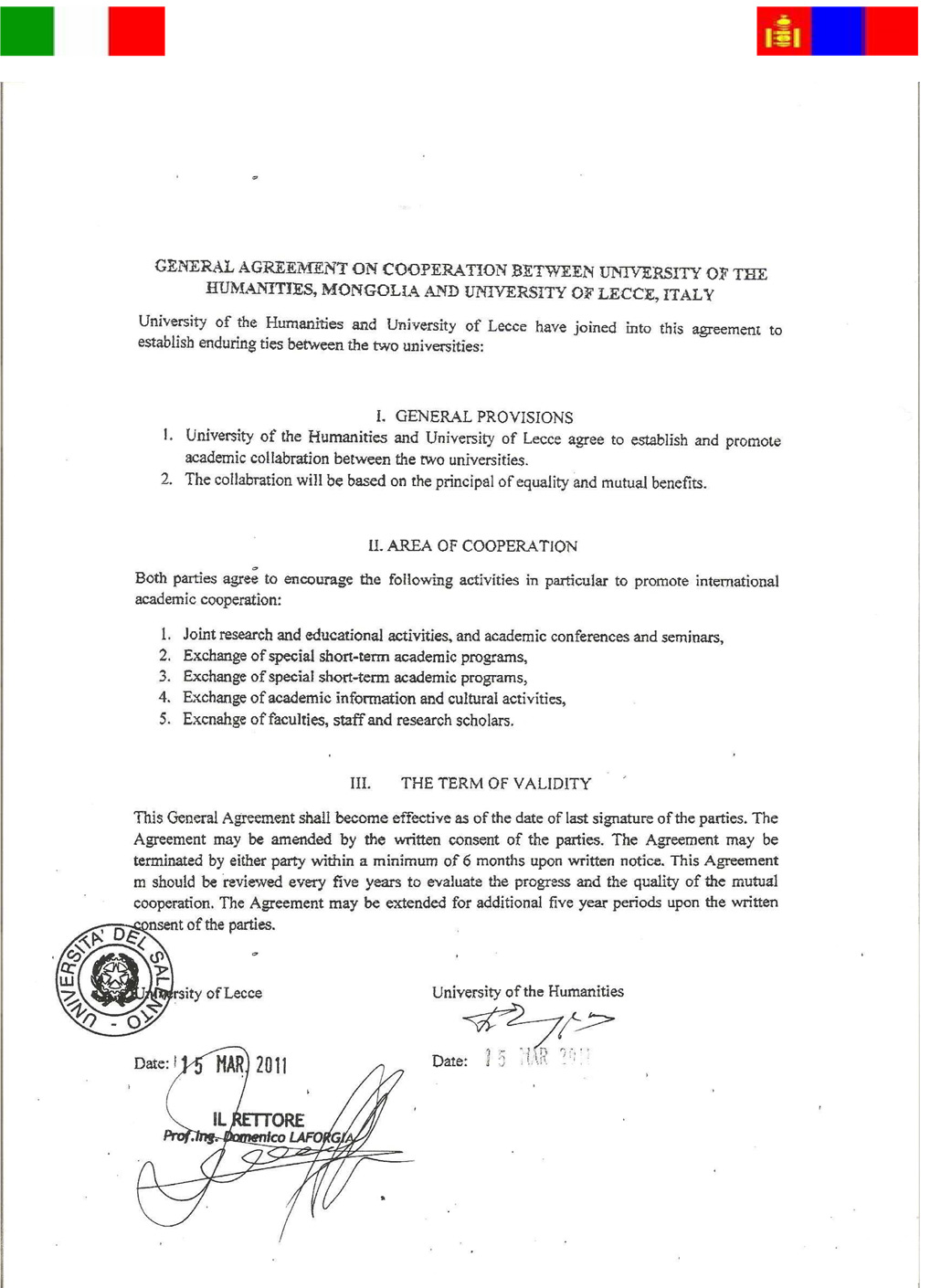 Il 15 marzo 2011, su invito dell'Istituto per la Cooperazione con i Paesi Esteri, una delegazione della Università Umanistico della Capitale Ulaambaatar, formata dal Presidente Prof. Dr. Begz CHULUUNDORJ, Pref.ssa Ganbaatar BATKHUYAG, Prof. Tugjamba NAVCHAA anno visitato l'Università di Lecce.