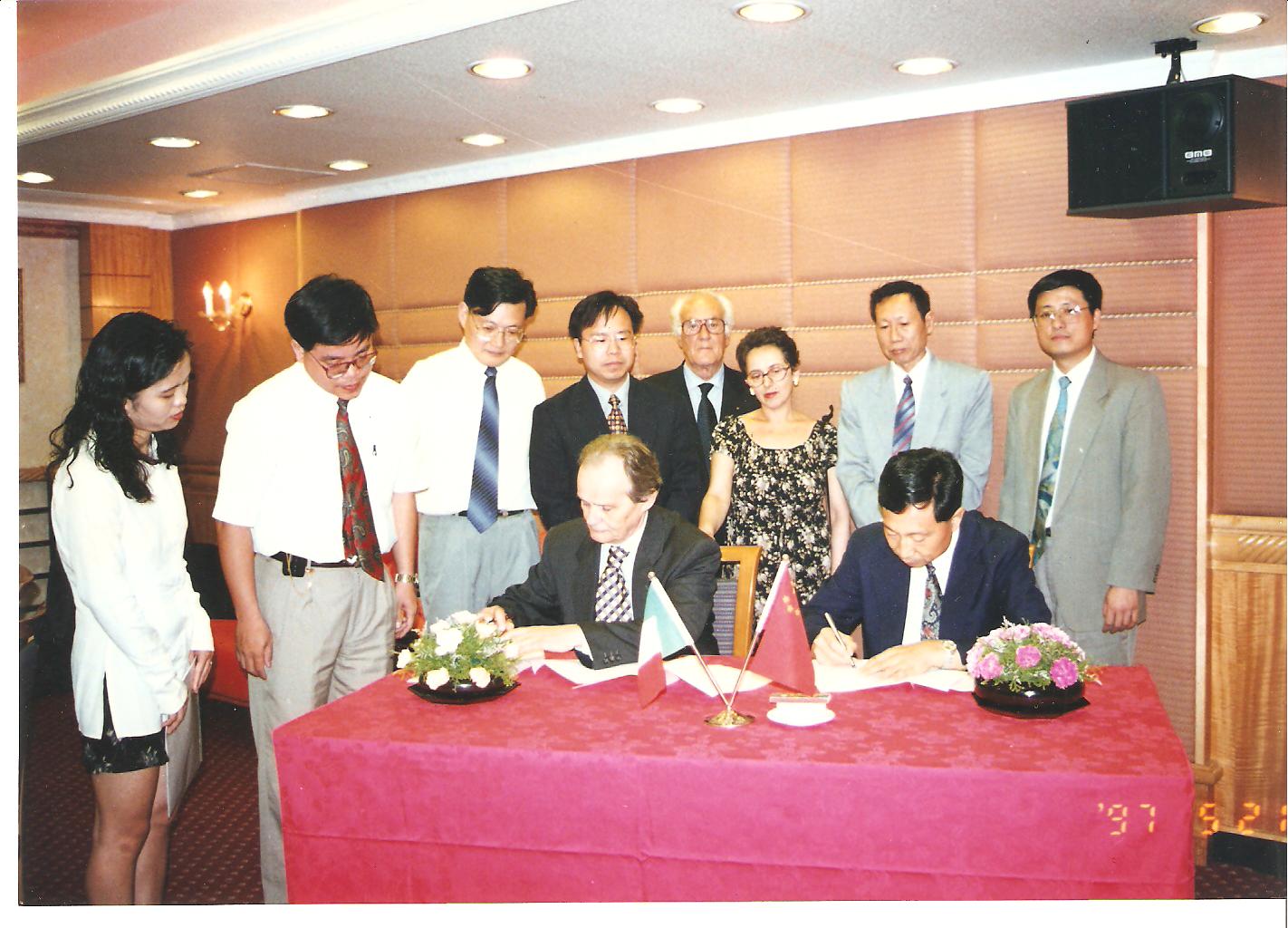 Visita a Bari Mr. SHEN KUN Vice Direttore della Free Zhone of Guangzhou. Presenti al tavolo di lavoro, da sinistra il l'allora Preside della Facoltà di Economia della Università di Bari Prof. Giovanni Gironi, Presidente della Regione Puglia Dott. Givanni Copertino, il Vice direttore Mr. Shen Kun e la propria interpetre e il Segretario Generale dell'Istituto Cooperazione Paesi Esteri.
