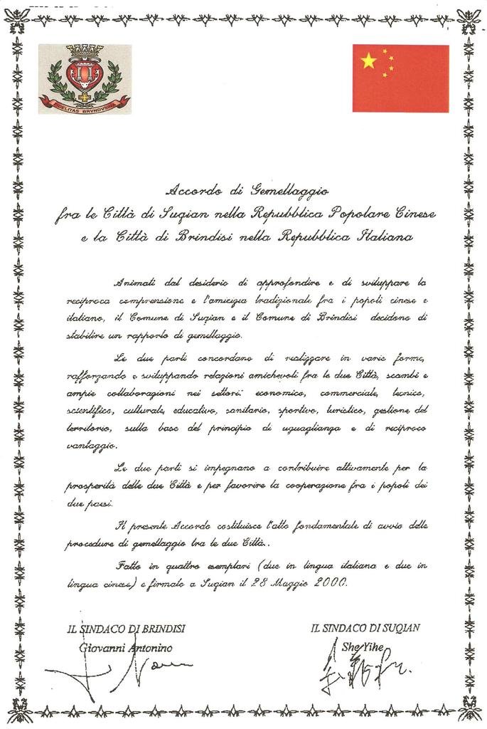 Un patto di amicizia e collaborazione reciproca è stato siglato fra la città di Modena e quella cinese di Suqian, presso la sede della Camera di Commercio di Via Ganaceto a Modena. L'incontro, organizzato dai comuni di Modena e Suqian, dall'Università di Modena e Reggio, dalla Camera di Commercio e dall'associazione Terre e Identità, ha gettato il primo seme per lo sviluppo di collaborazioni in ambito industriale, culturale e turistico fra due realtà geograficamente molto lontane ma potenzialmente molto simili.