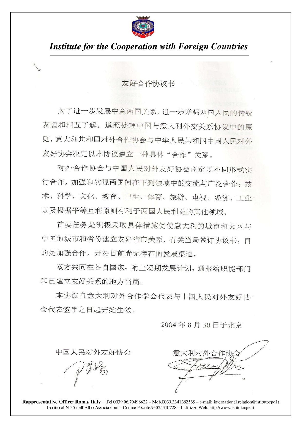 L'associazione di amicizia con paesi stranieri (CPAFFC) del popolo cinese è un’organizzazione nazionale del popolo impegnata nella diplomazia della Repubblica popolare di Cina. Gli obiettivi dell'associazione sono quelli di migliorare l’amicizia fra i popoli, di favorire la cooperazione internazionale, di salvaguardare la pace nel mondo e di promuovere lo sviluppo comune. A nome del popolo cinese, stringe e approfondisce l'amicizia nella comunità internazionale e fra i vari paesi del mondo, depone e espande la base sociale di relazioni amichevoli tra la Cina e altri paesi e lavora con l’obiettivo di favorire il progresso umano e solidarietà. Nello svolgimento della sua attività, ha supporto da parte del governo e l'assistenza di tutti i settori della società. Essa ha attualmente 46 organizzazioni di amicizia regionale o nazionale e ha stabilito il rapporto di rispettosacollaborazioneconquasi500 organizzazioni non governative e istituzioni in 157 paesi.